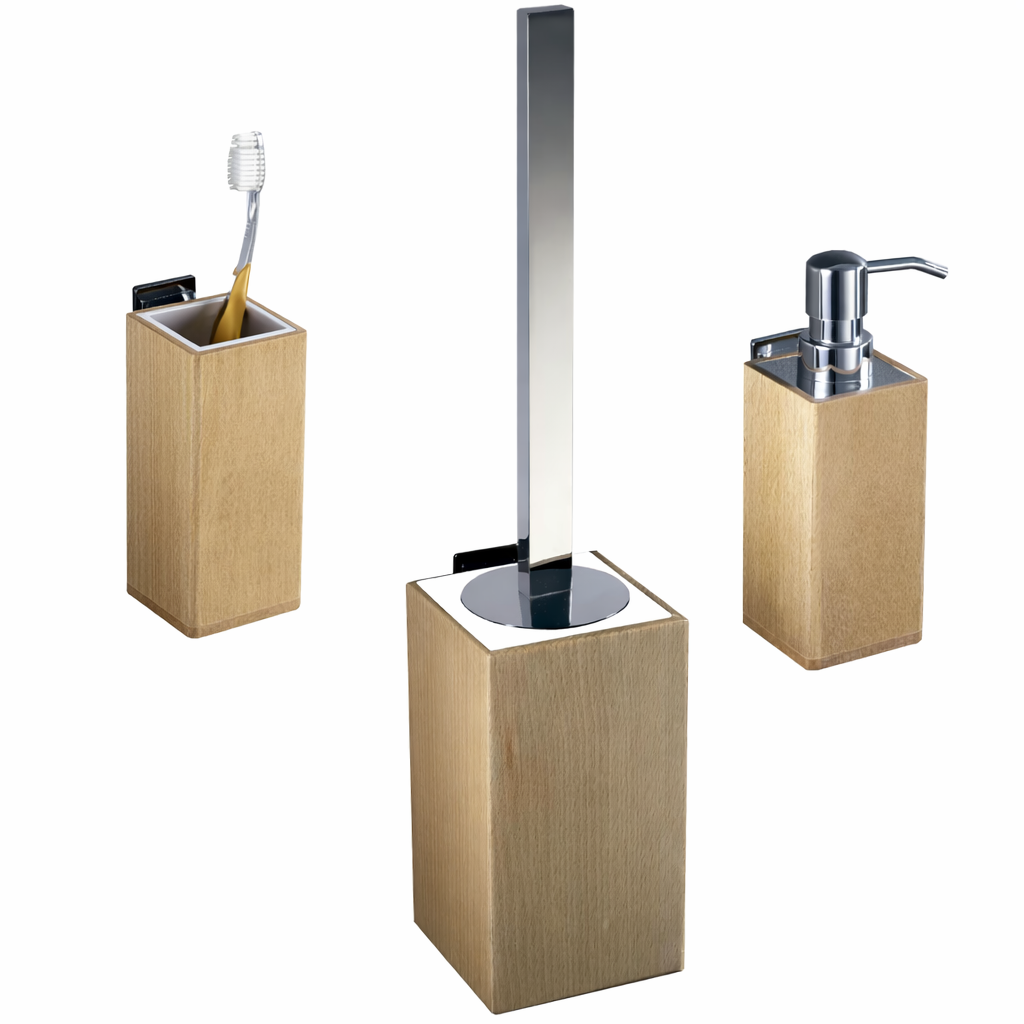 Te presentamos el conjunto de accesorios de baño Natura, diseñado para instalación a pared y perfecto para aportar calidez y estilo al espacio.