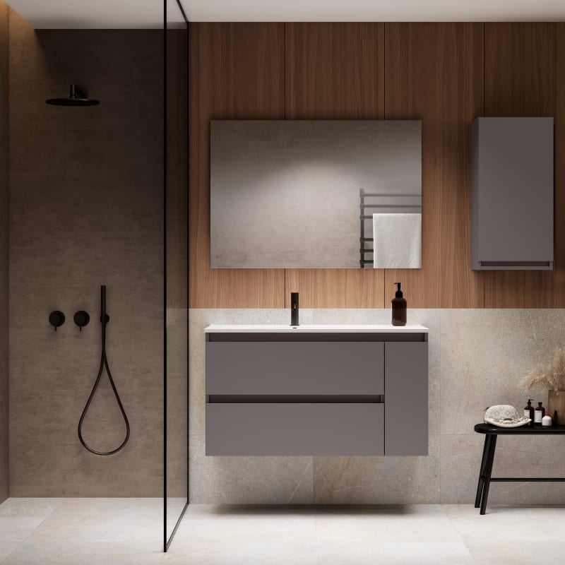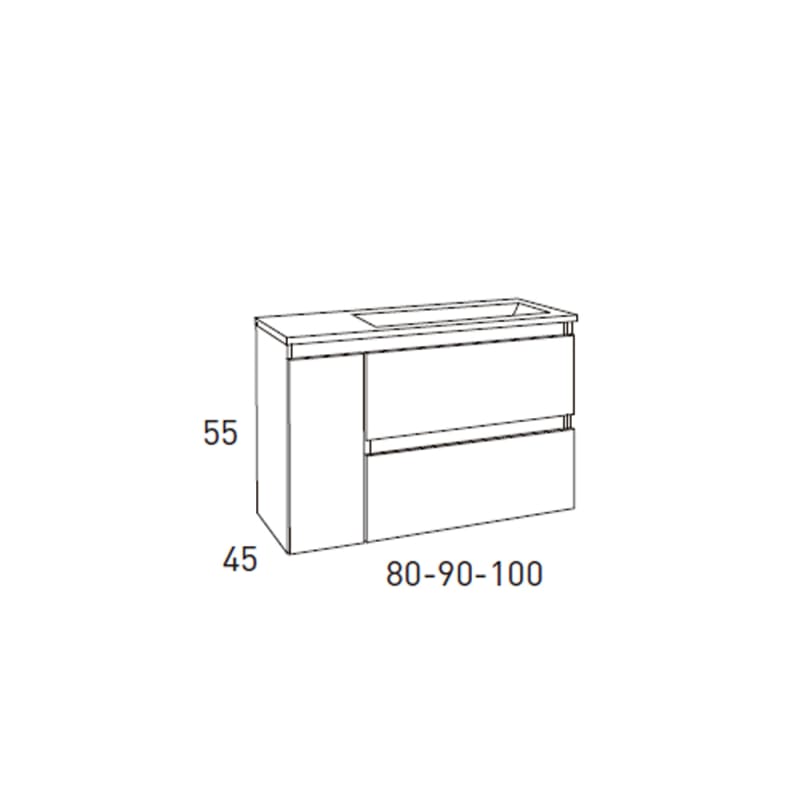 Descubre nuestro mueble de baño Box. Un mueble con una puerta y 2 cajones, polivalente, ideal para espacios de cualquier tamaño. Disponible en varias medidas, con una altura de 55cm y profundidad de 46cm, se adaptan perfectamente a tu baño. Su instalación es sencilla, montándose directamente en la pared y cuenta con colgado.