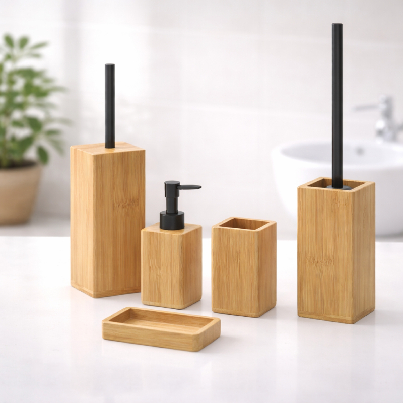 Set de accesorios de baño de sobremesa compuesto por piezas fabricadas en resina de alta calidad combinada con bambú natural.