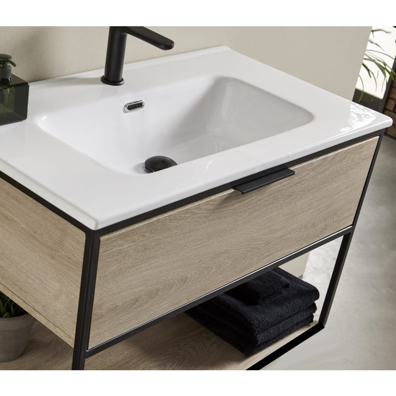 Este modelo combina un cajón de extracción total y un estante abierto, perfectos para mantener tus objetos organizados y siempre a mano. Incluye una encimera de madera y un lavabo sobre encimera ovalado, una tendencia que destaca por su estética ligera y sofisticada.