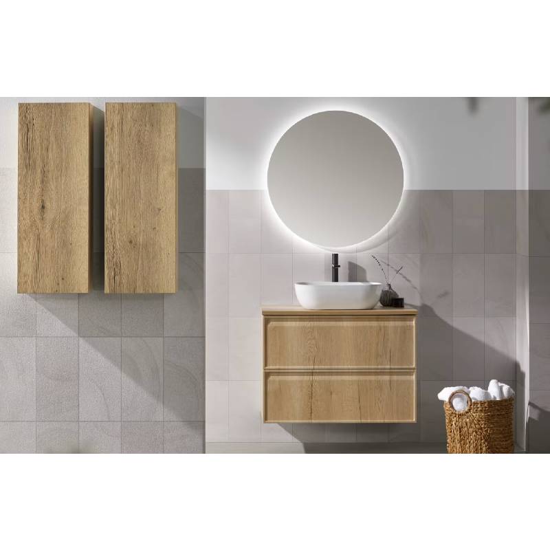 El conjunto incluye un lavabo de cerámica sobre encimera y una encimera a juego, creando un conjunto armonioso y muy visual. Además, está disponible en 60, 80 y 100 cm de ancho, para adaptarse a estancias de diferentes tamaños.