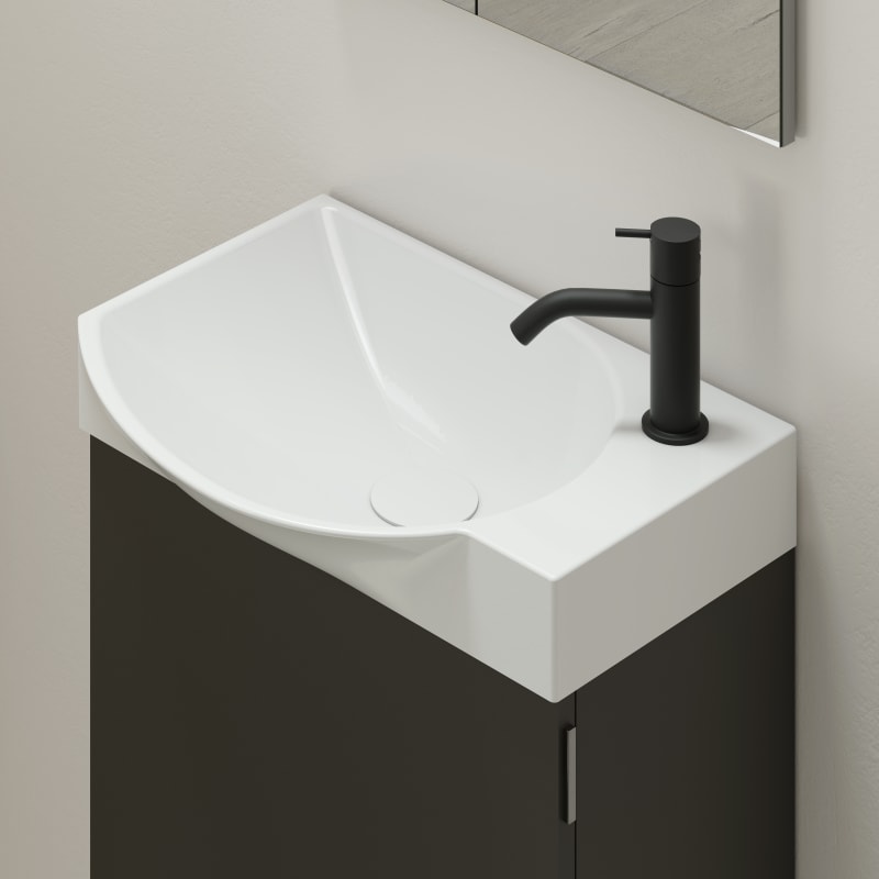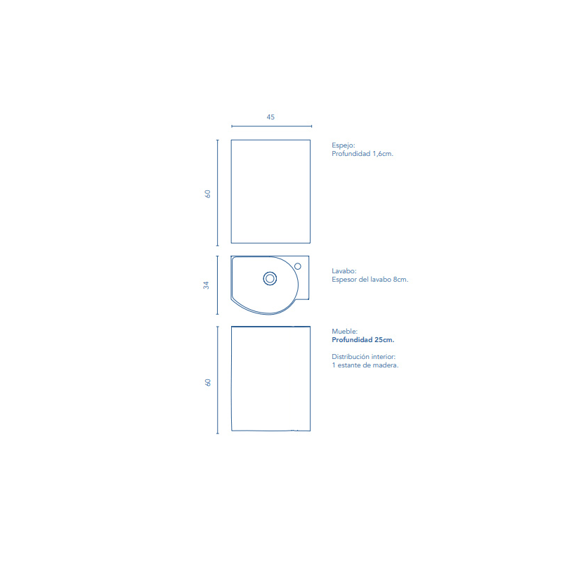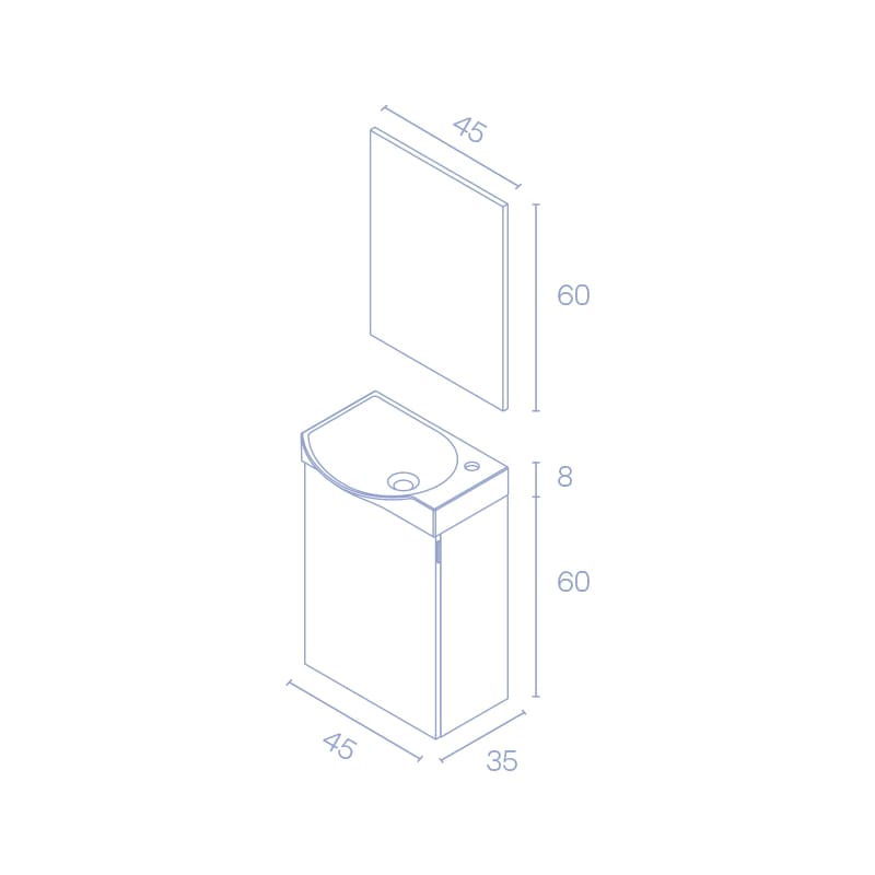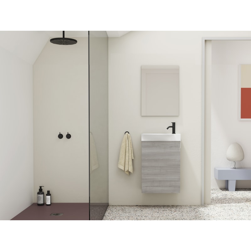 Descubre nuestro mueble de baño con fondo reducido 1 puerta suspendido Amizuva, ideal para espacios de cualquier tamaño. Disponible en varias medida 45 cm ancho y 34 cm fondo se adaptan perfectamente a tu baño. Su instalación es sencilla, montándose directamente en la pared y cuenta con colgado.