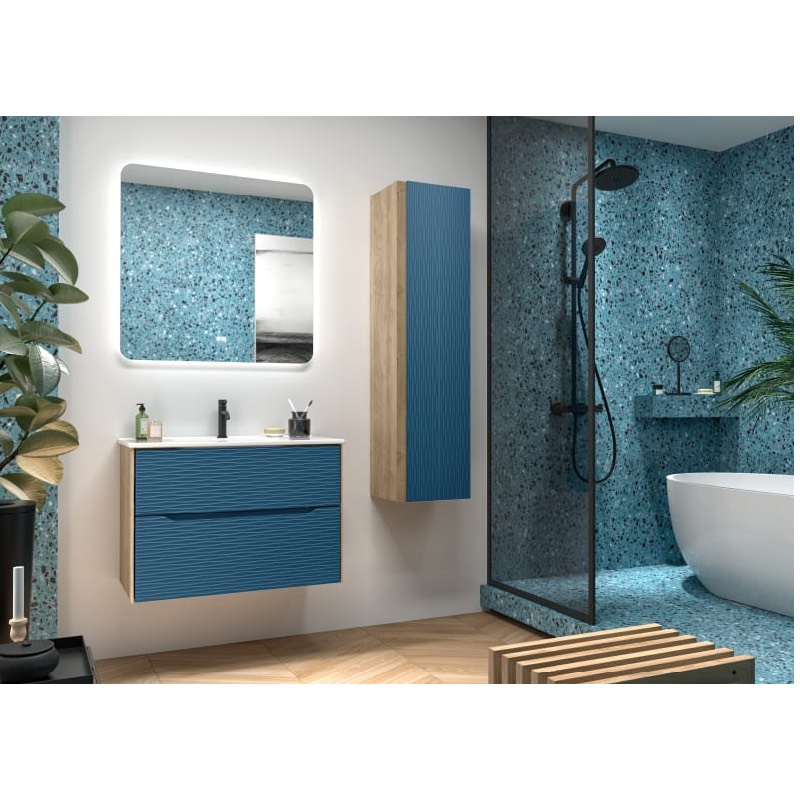 Disponemos de varias medidas de mueble para que encuentres la opción que mejor se adapte a tu baño:80 o 100 cm de ancho, con un fondo de 46 cm y una altura de 55 cm. El conjunto también incluye 2 cajones con cierre suave amortiguado y guías Grass originales, con un acabado interior textil que añade un toque de sofisticación.