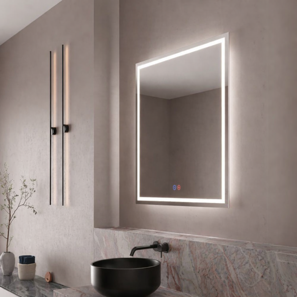 Entre los puntos fuertes de los espejos LED de Ledimex destacan su premarco de aluminio, diseñado para disipar el calor, los LEDs de alta calidad con excelente reproducción cromática y luz uniforme, así como la cubierta de silicona que protege la iluminación. Además, incorpora una fuente de alimentación preparada para entornos húmedos y un práctico doble sensor táctil que permite controlar tanto el encendido de la luz como la función antivaho.