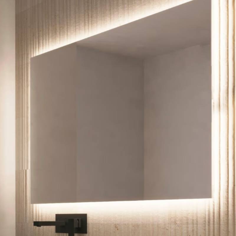 Los alicientes del espejo de baño con luz Suecia son su forma (al ser rectangular ofrece un mayor campo de visión), su luz trasera (más suave y que genera ambiente) y su sistema antihumedad (protege la fuente de alimentación trasera).