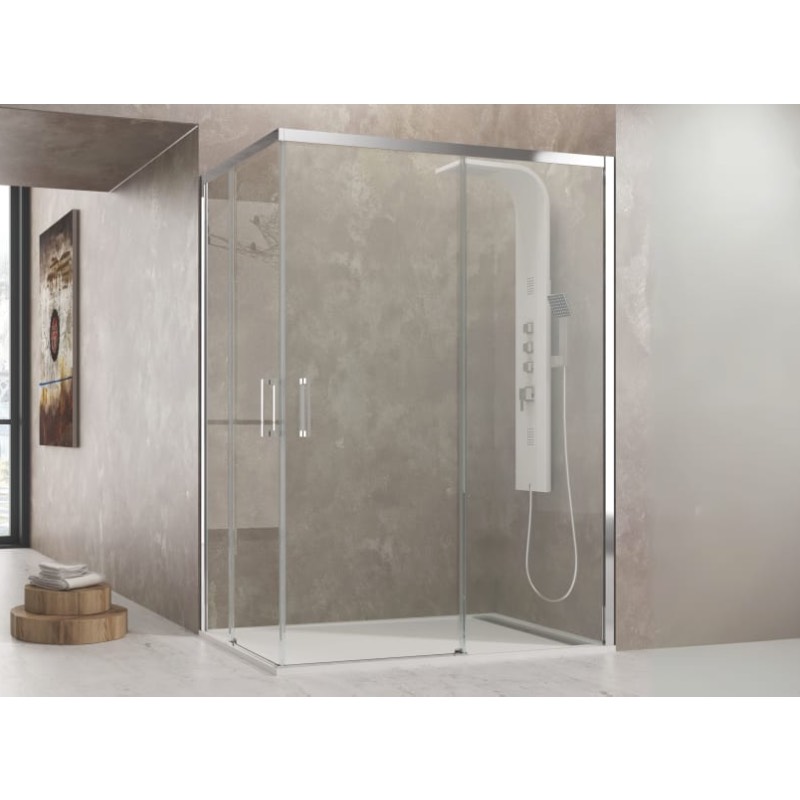 Transforma tu baño con nuestra mampara angular 2 fijos +2 Correderas, diseñada para aprovechar al máximo el espacio en esquinas y brindar un acceso cómodo y fluido.