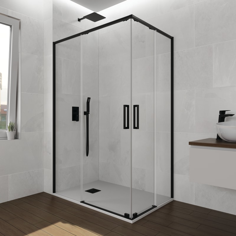 • Sistema : Las puertas correderas se desplazan suavemente para ofrecer un acceso cómodo, mientras que los paneles fijos frontal y lateral garantizan estabilidad y un diseño limpio y moderno.