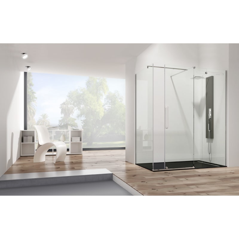 Perfecta para baños amplios que buscan maximizar el espacio disponible y brindar una sensación de amplitud. Con su sistema con 1 fijo + 1 corredera + 1 lateral fijo, disfrutarás de una ducha funcional, elegante y moderna.