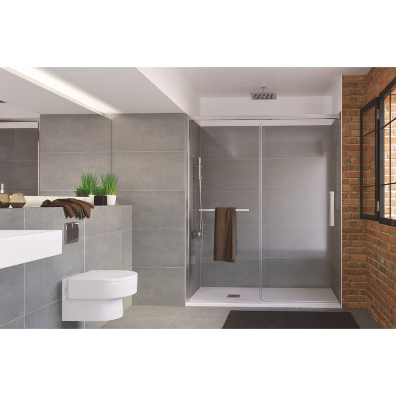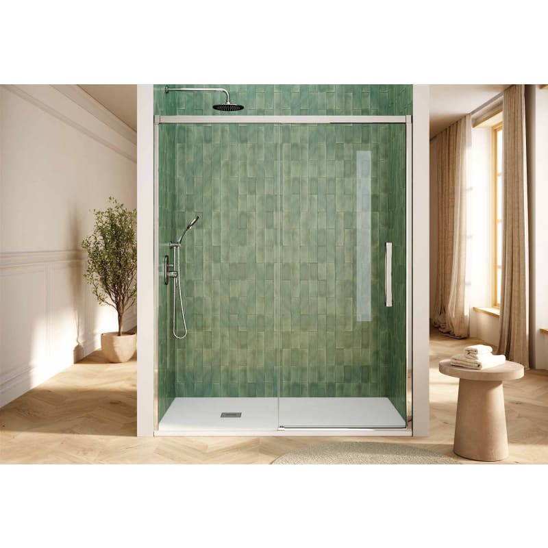 ¡Renueva tu baño con la mampara de 1 hoja fija y 1 hoja corredera sin perfil inferior y disfruta de un ambiente elegante y práctico!”