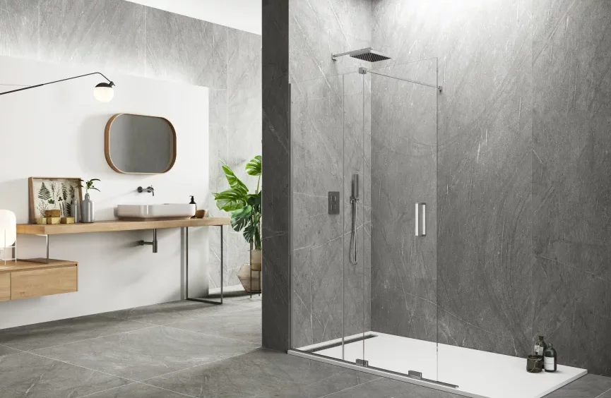 Transforma tu espacio de ducha con nuestra mampara fija más corredera sin perfil lateral, una opción que combina elegancia y practicidad. Este diseño innovador ofrece una apertura amplia y fluida, ideal para aquellos que buscan maximizar la accesibilidad y la estética de su baño.