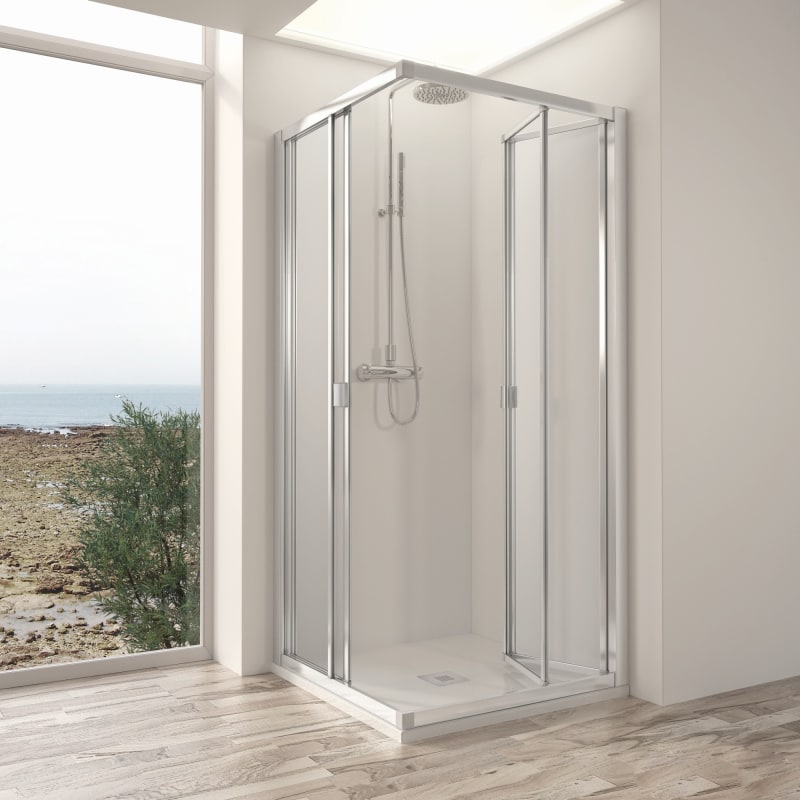 • Sistema mixto: La combinación de puertas plegables y correderas permite un acceso amplio y flexible, facilitando la entrada a la ducha sin ocupar espacio adicional.
