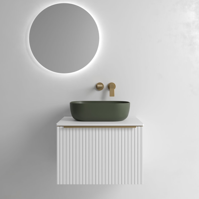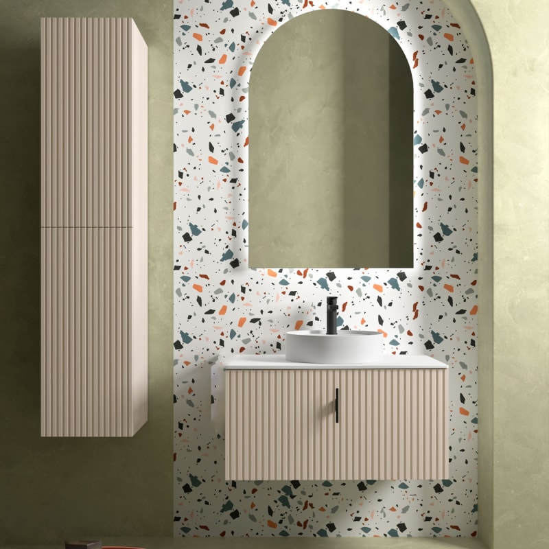 Su combinación de textura madera y acabado mate crea un ambiente cálido y contemporáneo. Se ofrece en anchos de 60, 80 y 100 cm, con 46 cm de fondo y 40,5 cm de altura, medidas perfectas para baños de distintos tamaños. La instalación suspendida aporta ligereza visual y facilita la limpieza diaria.