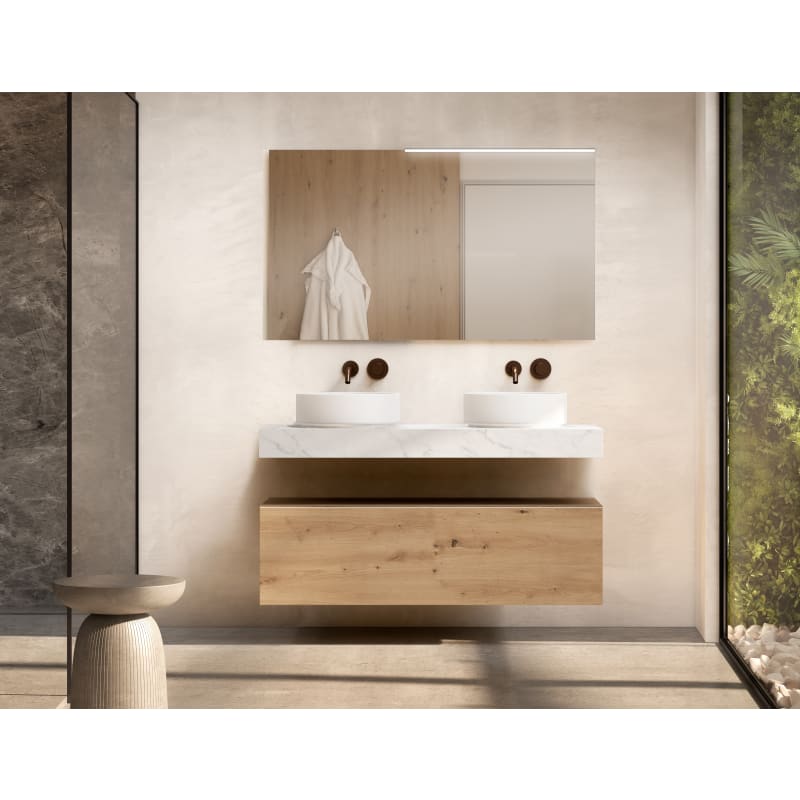 Dale un aire renovado a tu baño con este conjunto de diseño actual, formado por encimera de madera de 10 cm en acabado Cala y cajonera Nomad Visobath de 120 cm. Una opción pensada para quienes buscan un baño moderno, ordenado y con un toque elegante.