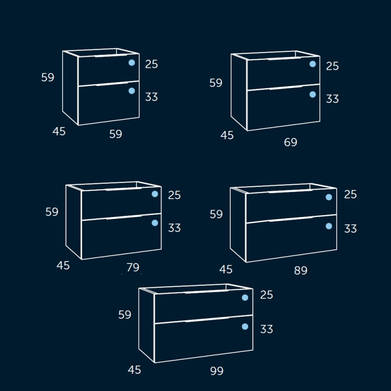Descubre nuestro mueble de baño Galsaky, polivalente, ideal para espacios de cualquier tamaño. Disponible en medidas de 60cm a 100cm, con una altura de 59cm y profundidad de 45cm, se adaptan perfectamente a tu baño. Su instalación es sencilla, montándose directamente en la pared y cuenta con colgado.