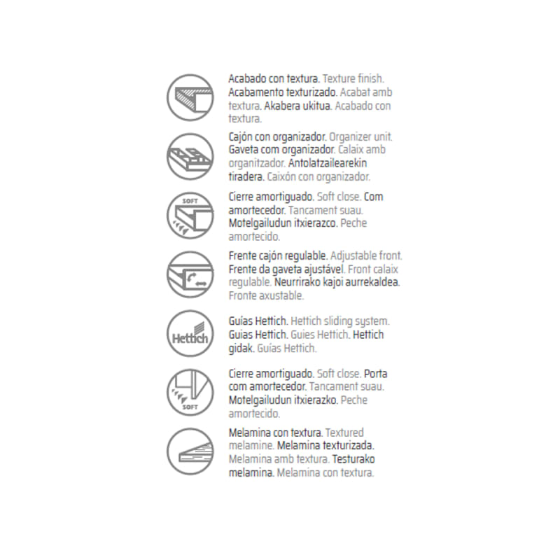 Los cajones cuentan con regulación en altura y un cierre amortiguado soft-close para evitar los golpes a la hora de cerrar el cajón.