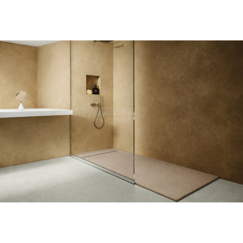 Disponible en seis colores —beige, blanco, gris claro, gris oscuro, negro y moka— se adapta fácilmente a cualquier estilo de baño. Incorpora rejilla cuadrada de acero inoxidable en posición estándar y válvula de desagüe Ø40 mm, ambas incluidas en el precio.